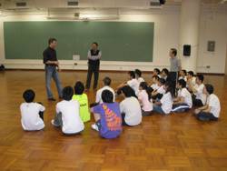 Klaus Jeske stellt sich der Klasse vor (oben links), führt Formen aus dem Wang Kiu-System vor (oben rechts), verdeutlicht mit Sven einige Besonderheiten (unten links) und antwortet auf die zahlreichen Fragen (unten rechts)
