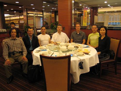 Freundschaftlicher Austausch beim Mittagessen: Leung Kwong Wah, ein langjähriger Schüler Leung Ting´s (5. Technikergrad, Master Level), Ludovic Mauchien, Chefredakteur der französischen Martial Arts Zeitschrift Karate Bushido, Leung Ting, Klaus Jeske, Sven, Heio und die Schwester Leung Ting´s.